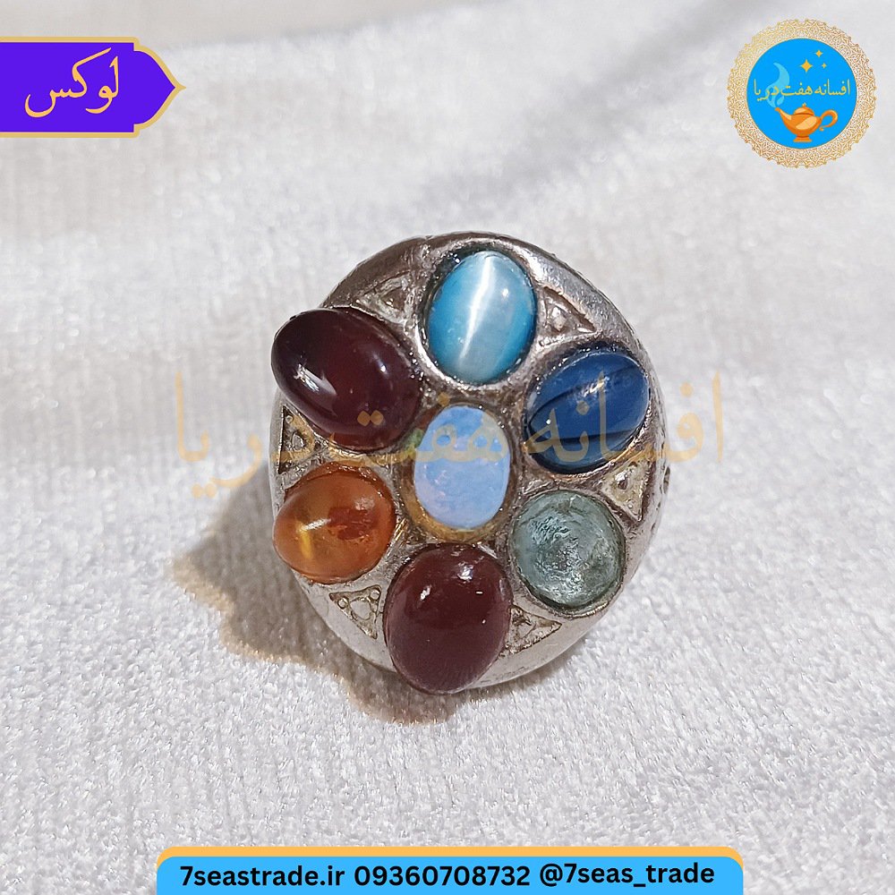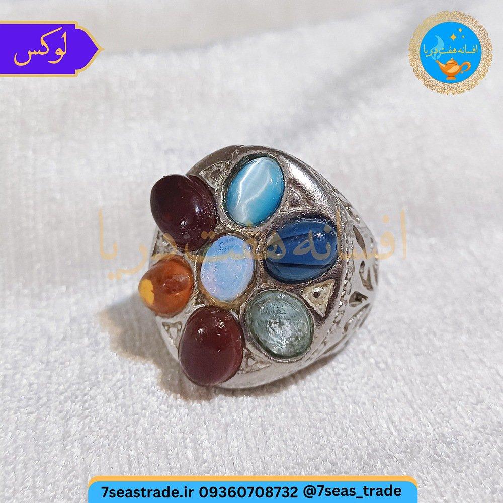 انگشتر نقره مردانه فاخر لوکس هفت نگین : چشم گربه کریز کولا آکوامارین عقیق کارنلین کهربا عقیق سرخ اوپال اصل