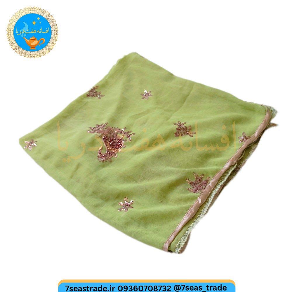 شال هندی رومیزی سبز پسته ای اندازه ۹۰×۱۹۰ طرح ساده گلدوزی [استوک وارداتی] ایراد ها : ریزش توپی ها