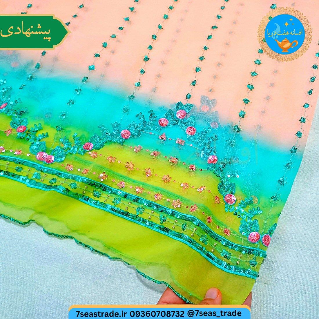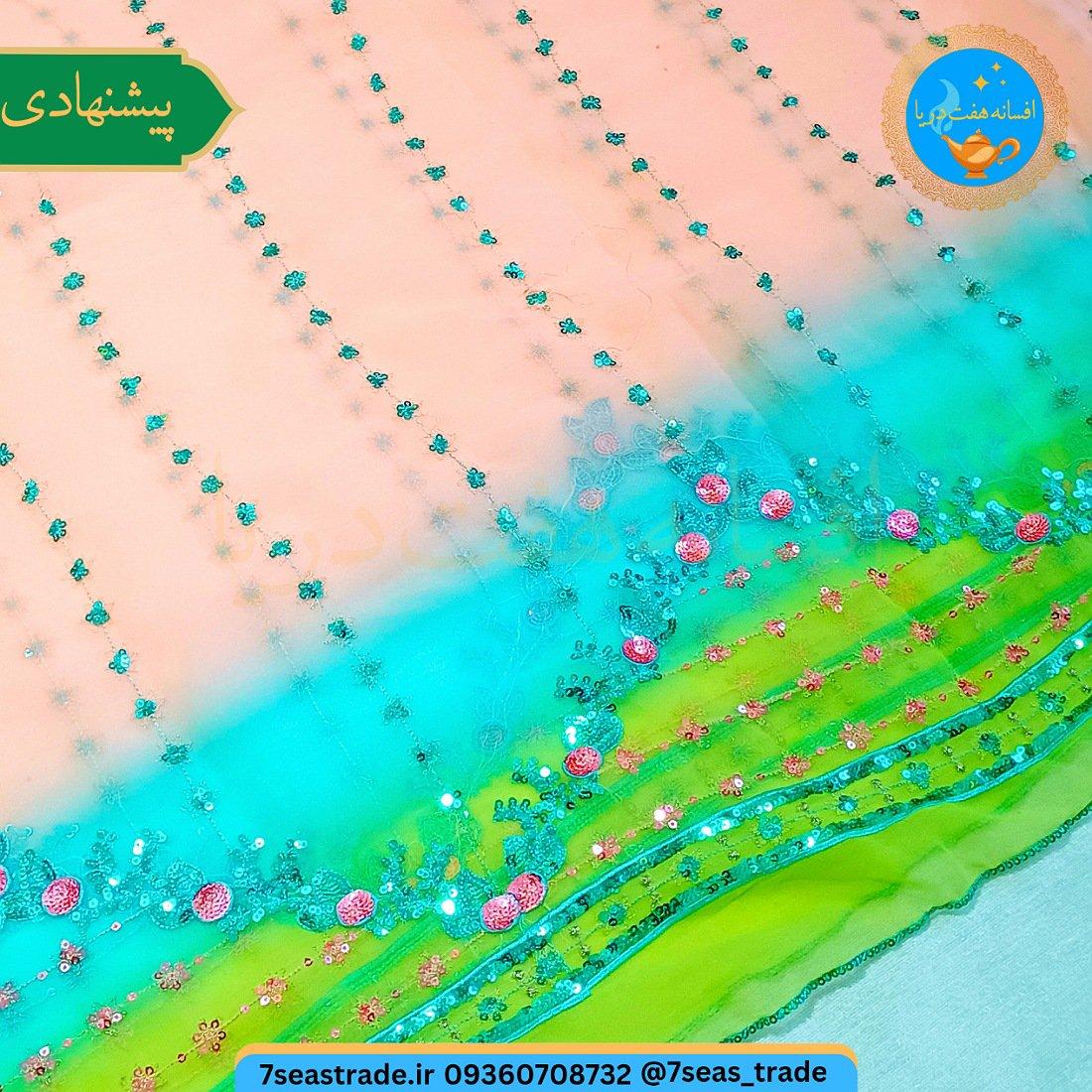 شال هندی سه رنگ، شال رومیزی هندی، شال گلدوزی و پولکدوزی، شال آبی سبز کرم-صورتی، شال تزئینی هندی، شال هندی استوک، شال زنانه هندی، رومیزی هندی گلدوزی، پارچه هندی زیبا، شال رنگارنگ هندی