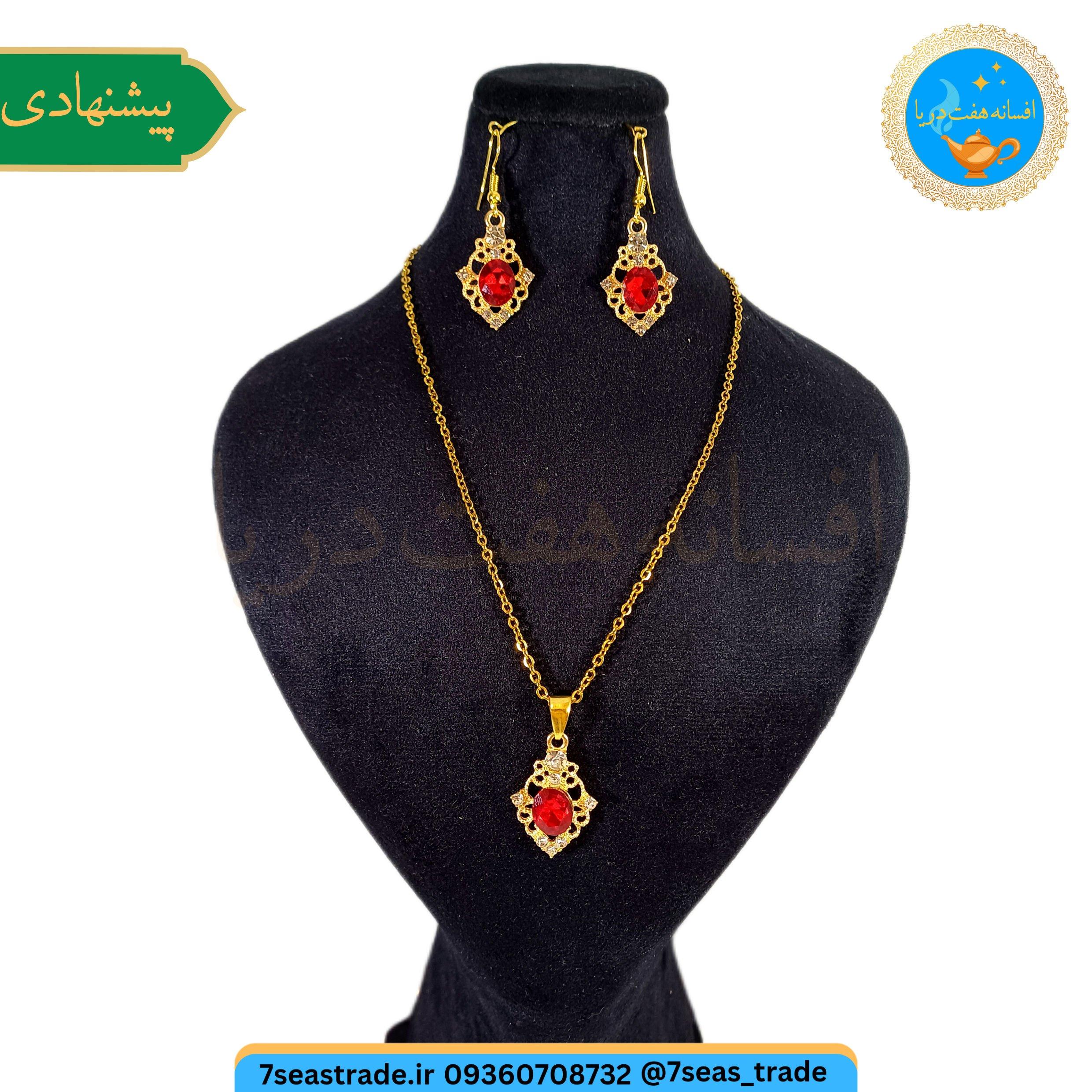 نیم ست زنانه طلایی برنجی نگین کریستال سرخ مدل یاقوت