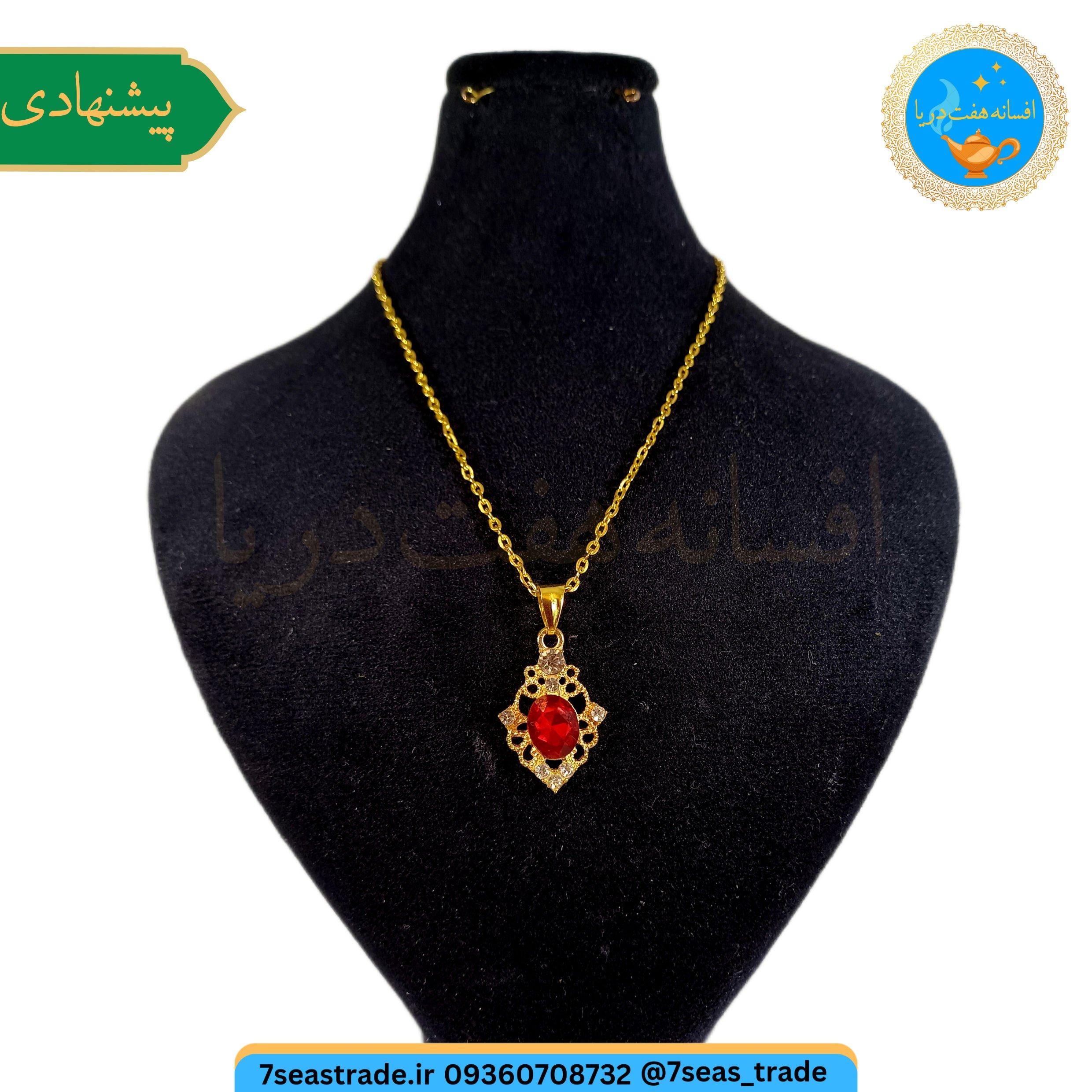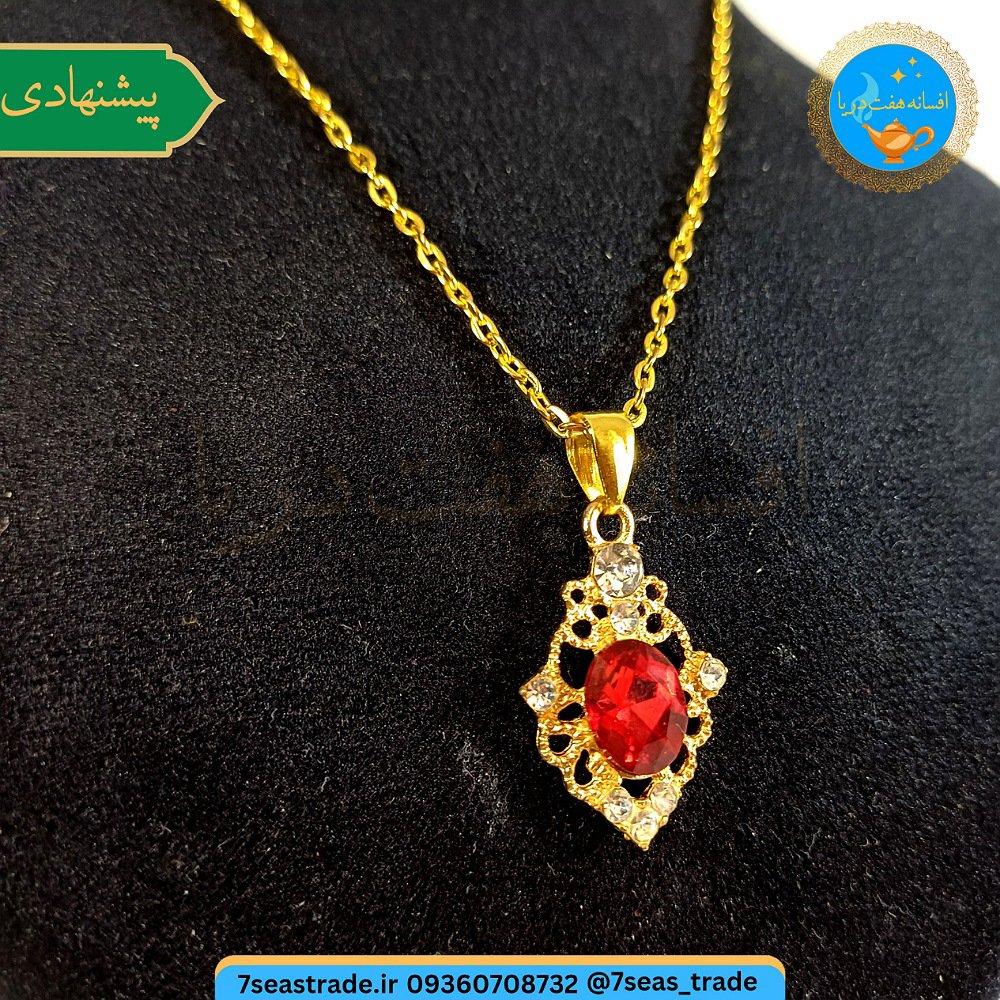 گردنبند زنانه طلایی مدال برنجی نگین کریستال سرخ مدل یاقوت