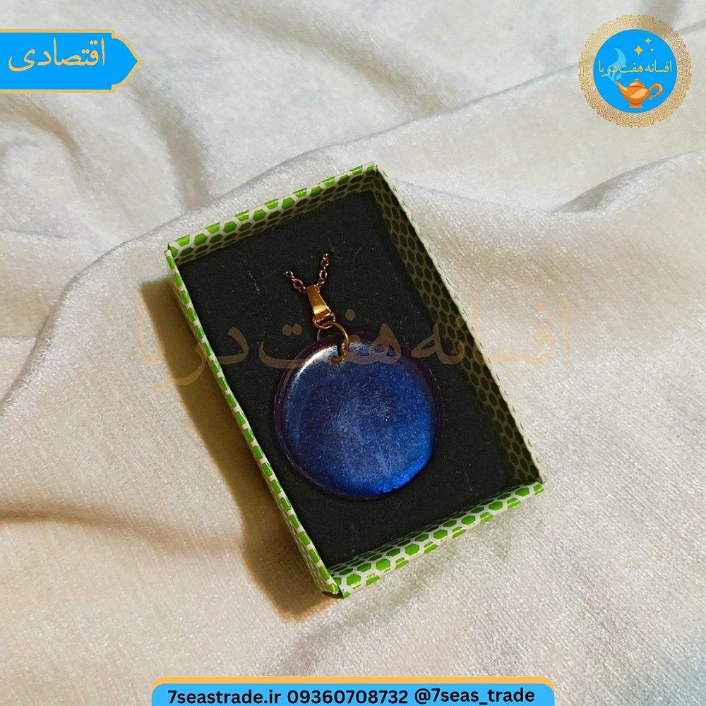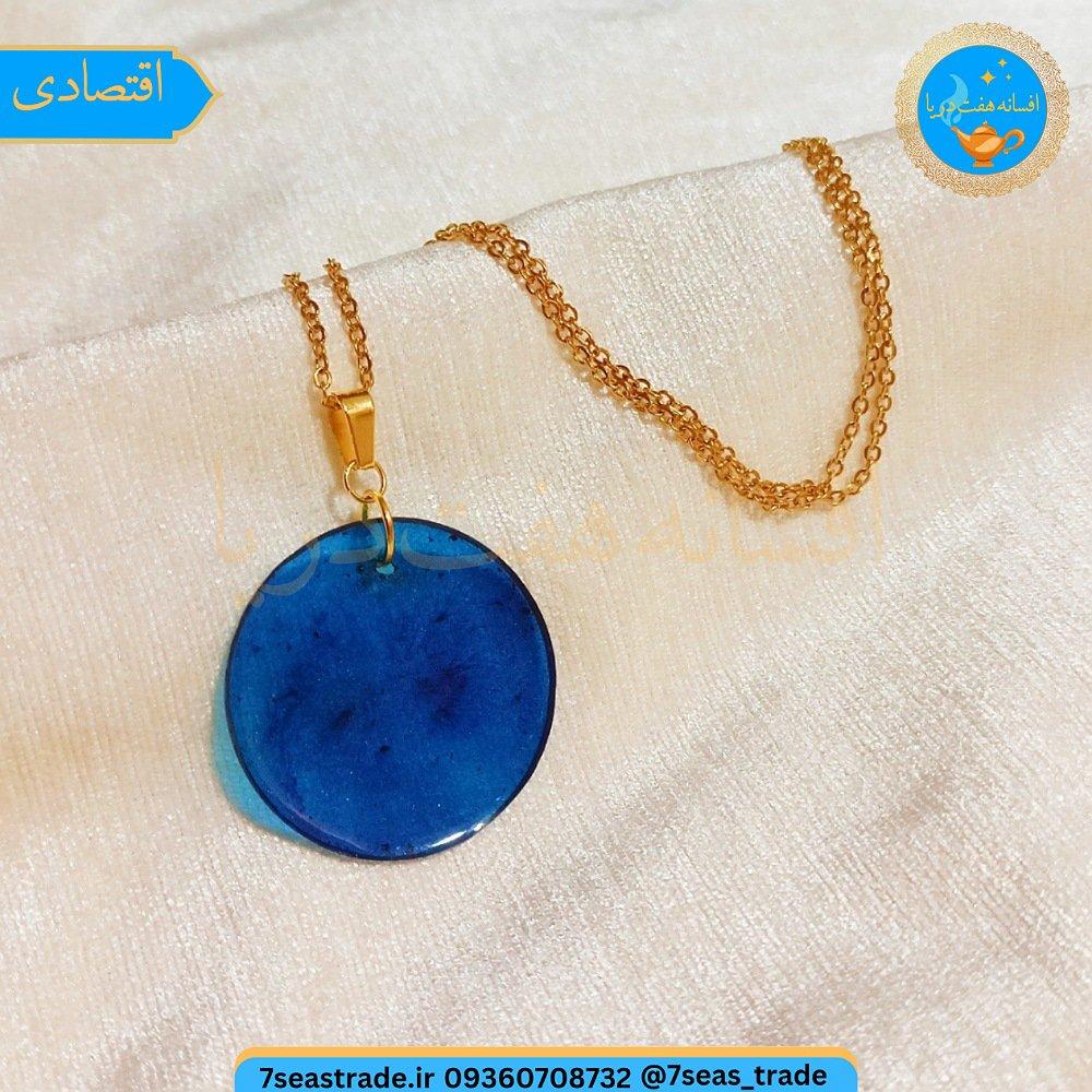 گردنبند فلزی طلایی مدال رزینی سکه ای کار دست مدل جوهری آبی تمام