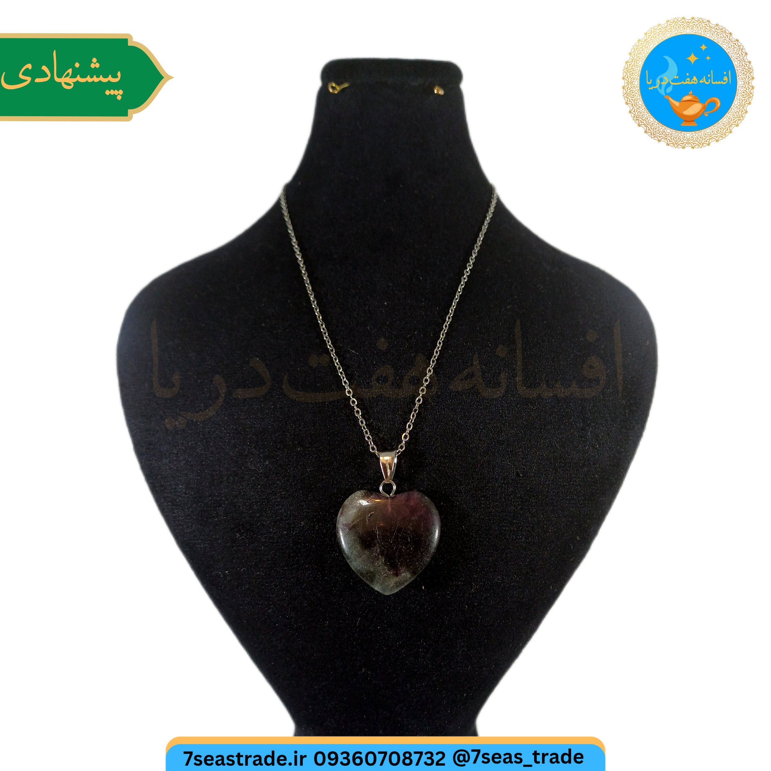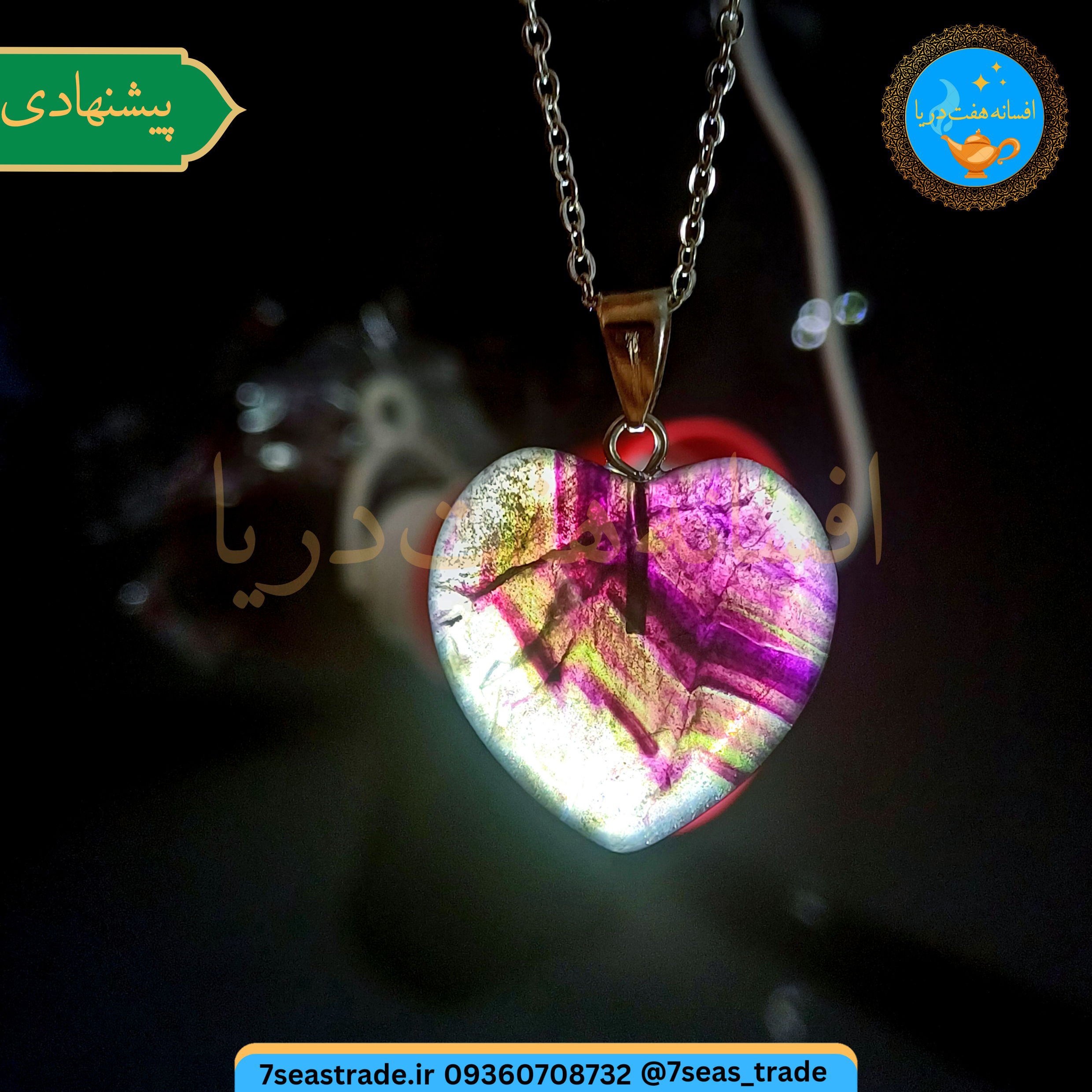 گردنبند فلزی نقره‌ای، مدال سنگ فلورین دو رنگ، فلورین سبز و بنفش، تراش قلب فلورین، گردنبند سایز بزرگ، گردنبند زنانه مردانه، گردنبند لوکس، زیورآلات دستساز، گردنبند خاص، خرید گردنبند فلورین، گردنبند طبیعی، زیورآلات استایلیش، گردنبند رمانتیک، گردنبند رنگی، هدیه خاص
