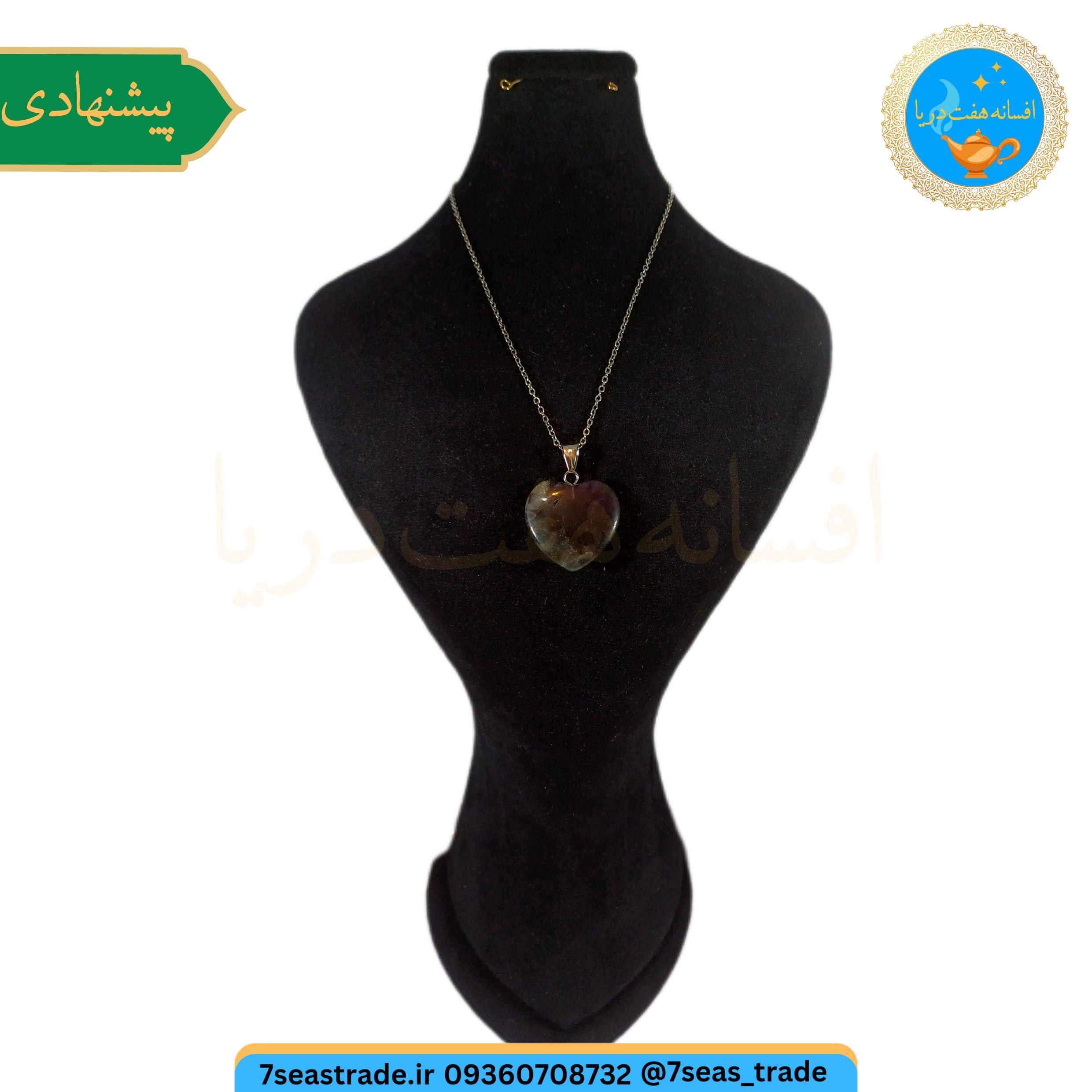 گردنبند فلزی نقره ای مدال سنگ فلورین دو رنگ سبز و بنفش اصل طبیعی تراش قلب سایز بزرگ