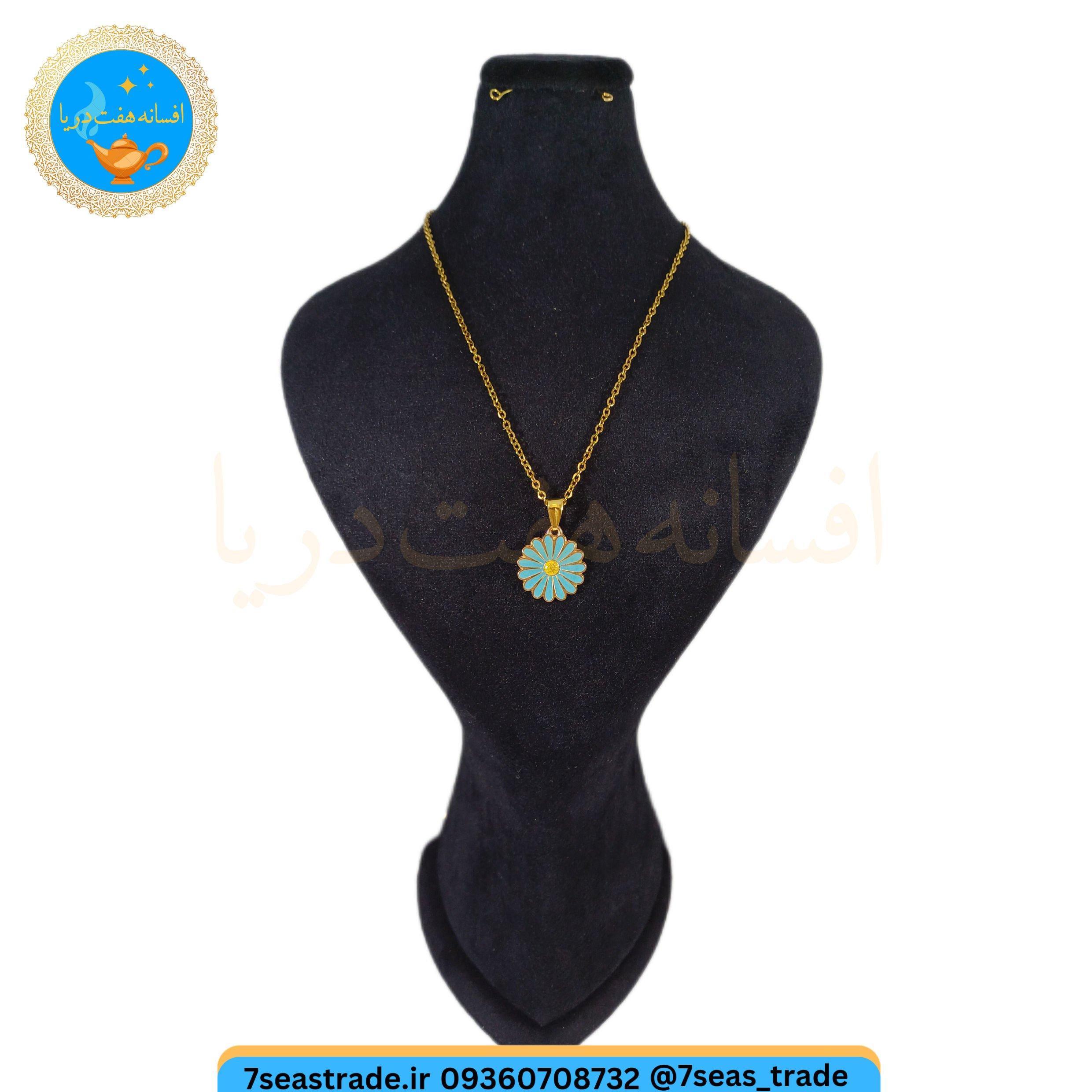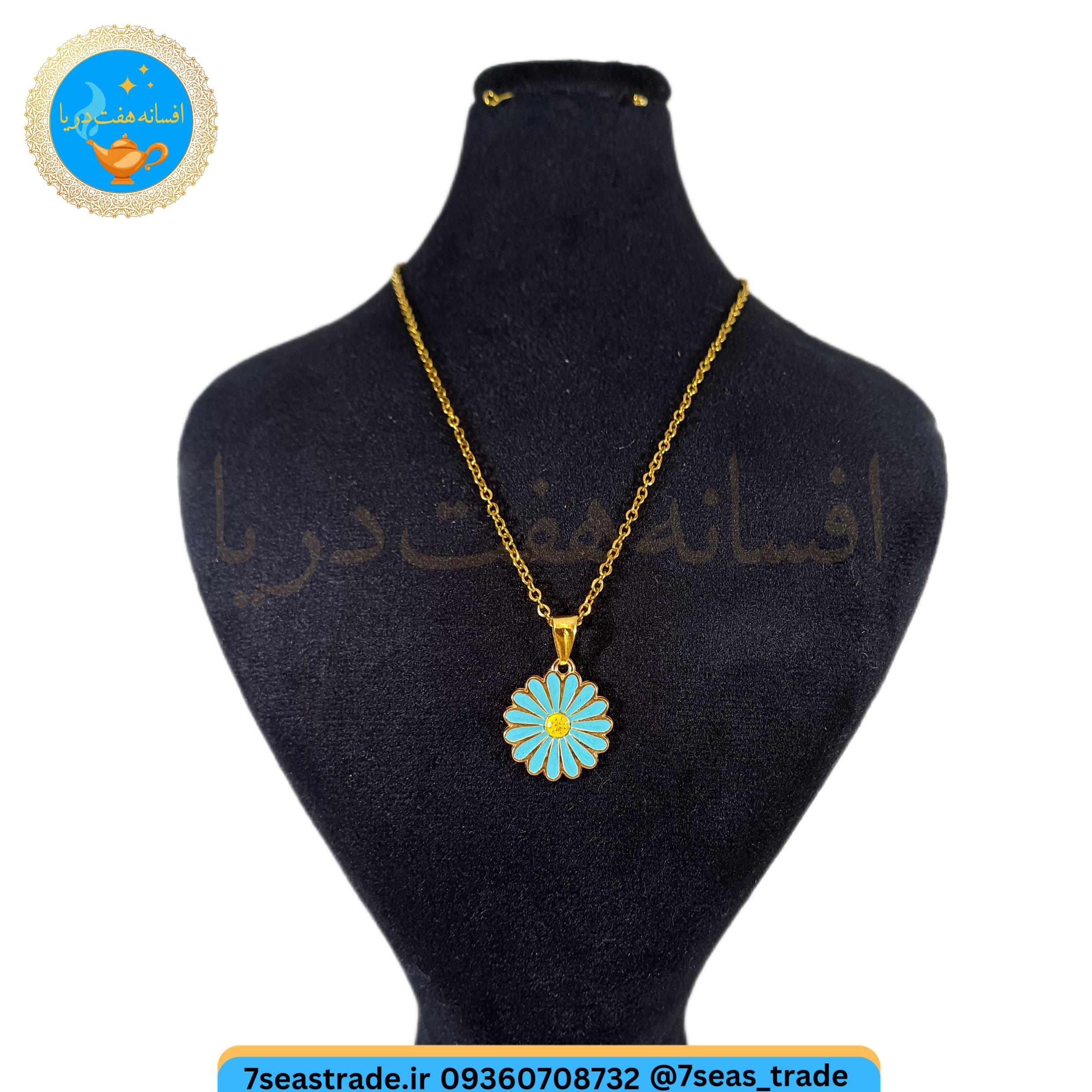 گردنبند فلزی طلایی مدال فلزی رنگی مدل بابونه رنگ آبی آسمانی