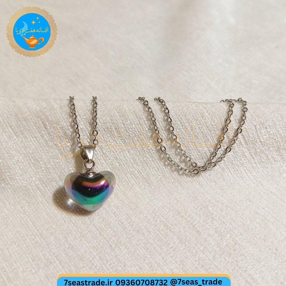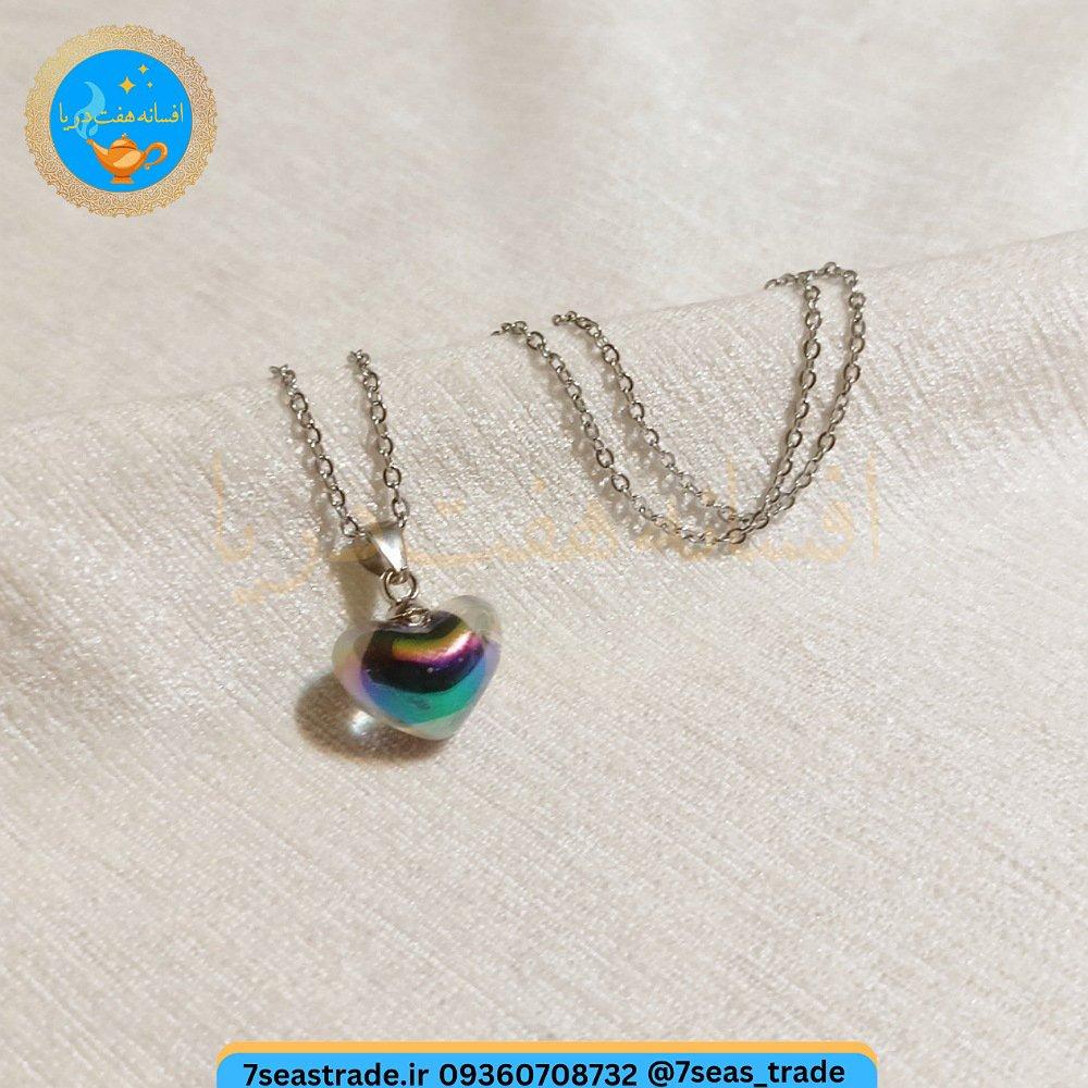 گردنبند نقرهای، گردنبند قلبی، گردنبند شیشه رنگینکمانی، گردنبند فلزی زنانه، اکسسوری قلبی، گردنبند فانتزی، گردنبند شیک زنانه، گردنبند هدیه، گردنبند خاص، مدال قلبی شیشهای
