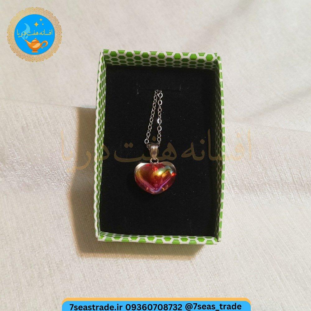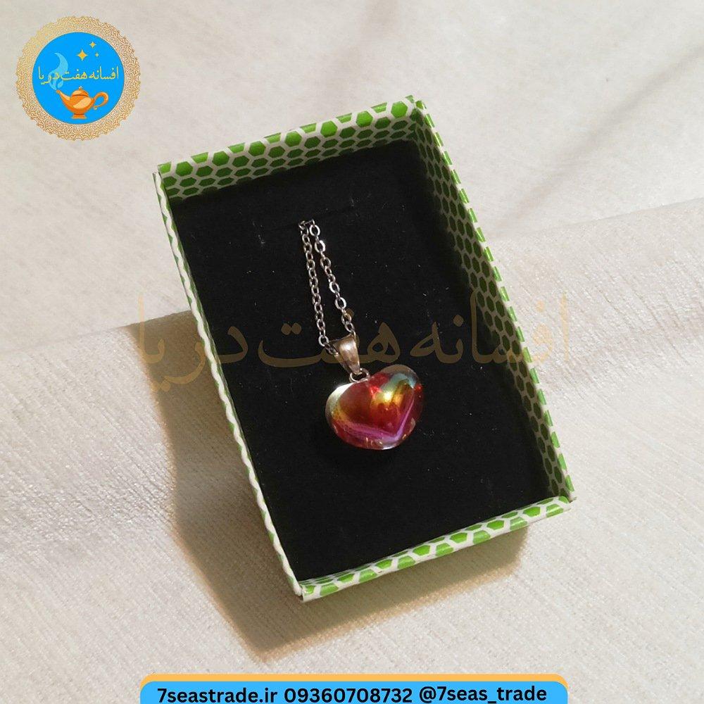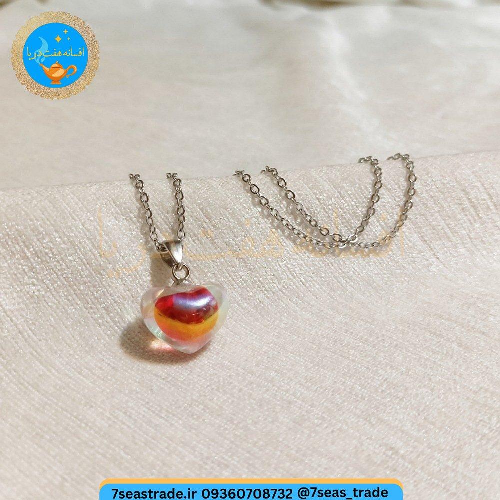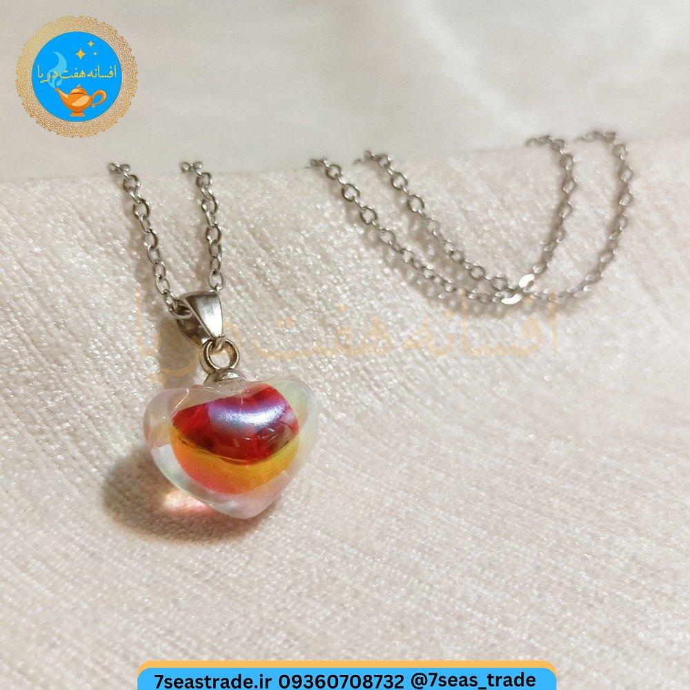 گردنبند فلزی نقره ای مدال شمایل مدل قلب شیشه ای رنگ رنگین کمانی روشن