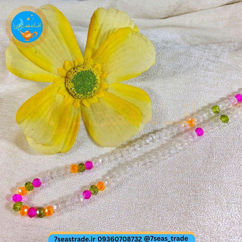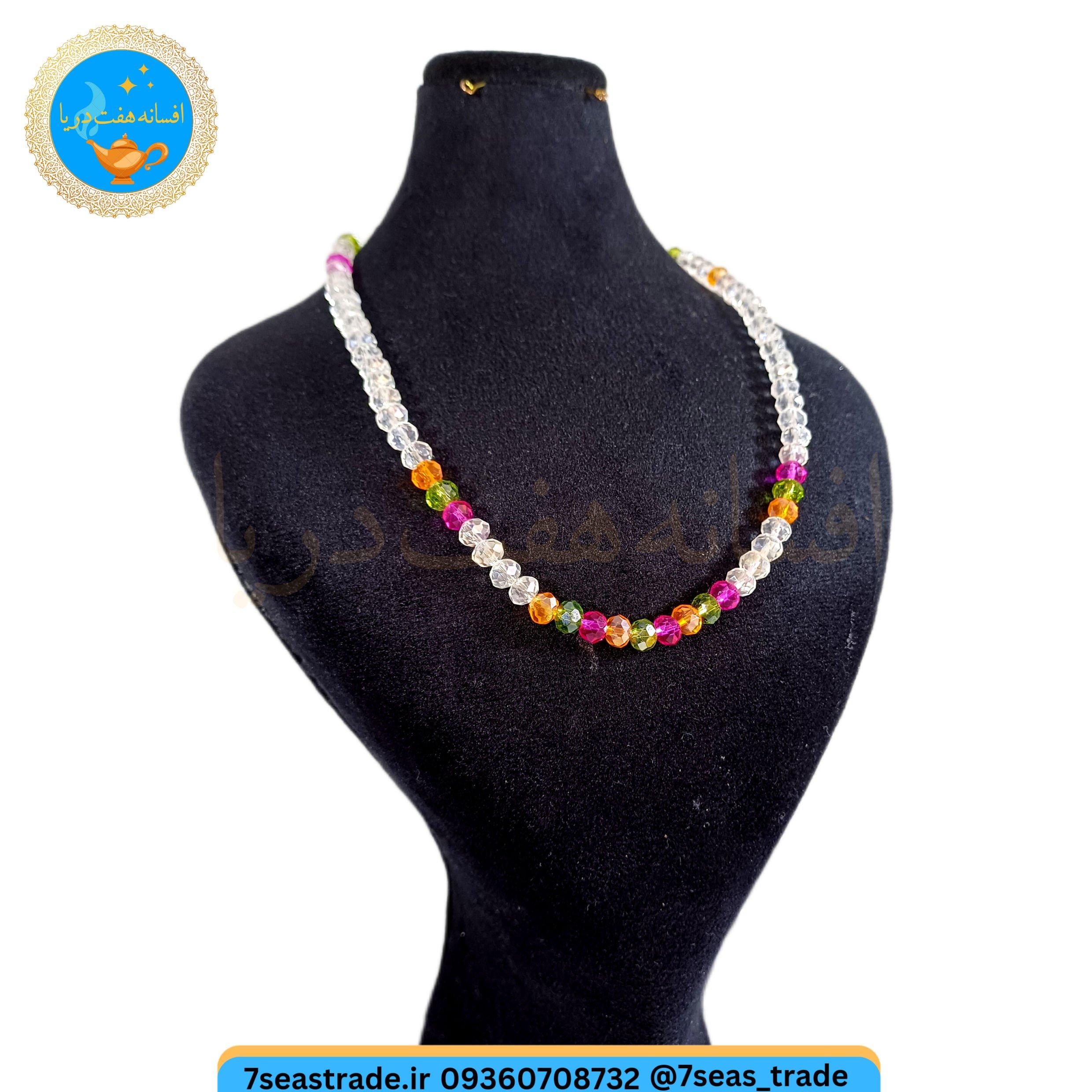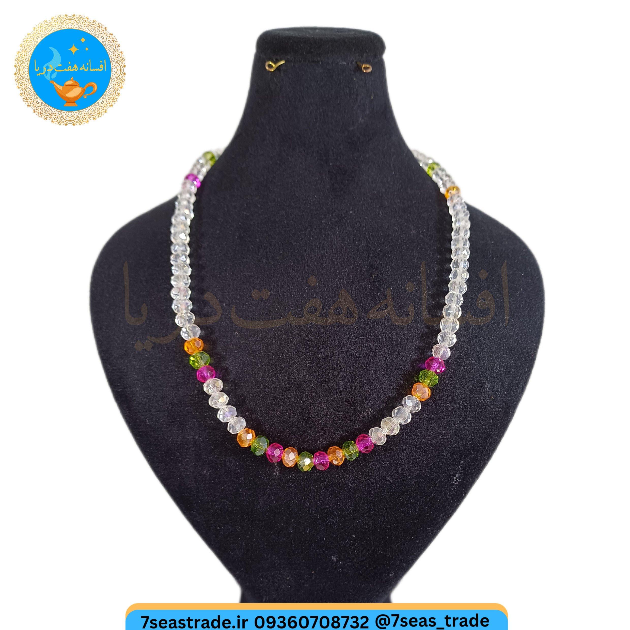 گردنبند دست ساز کریستال بی رنگ و ریزه کار کریستال صورتی سبز نارنجی مدل سپیده