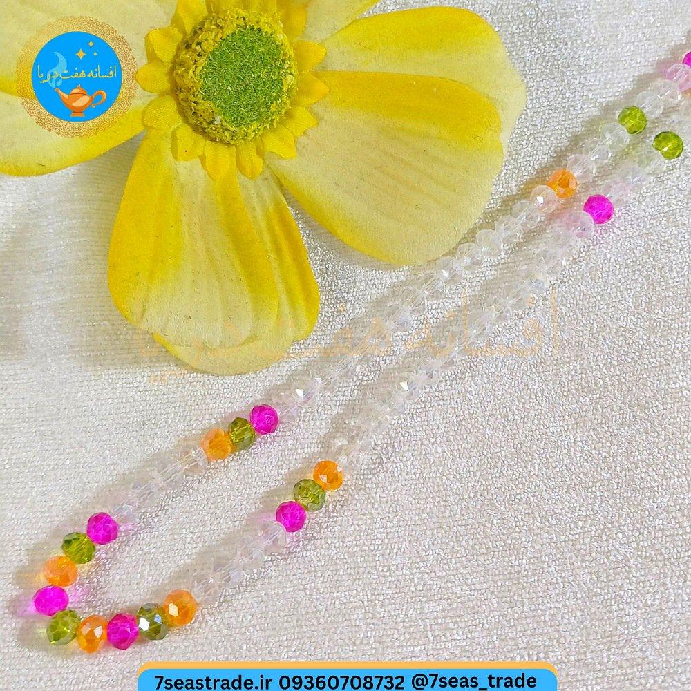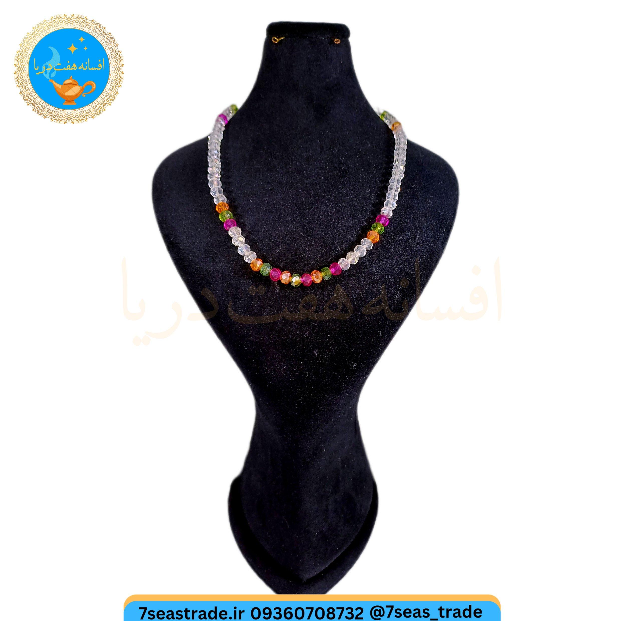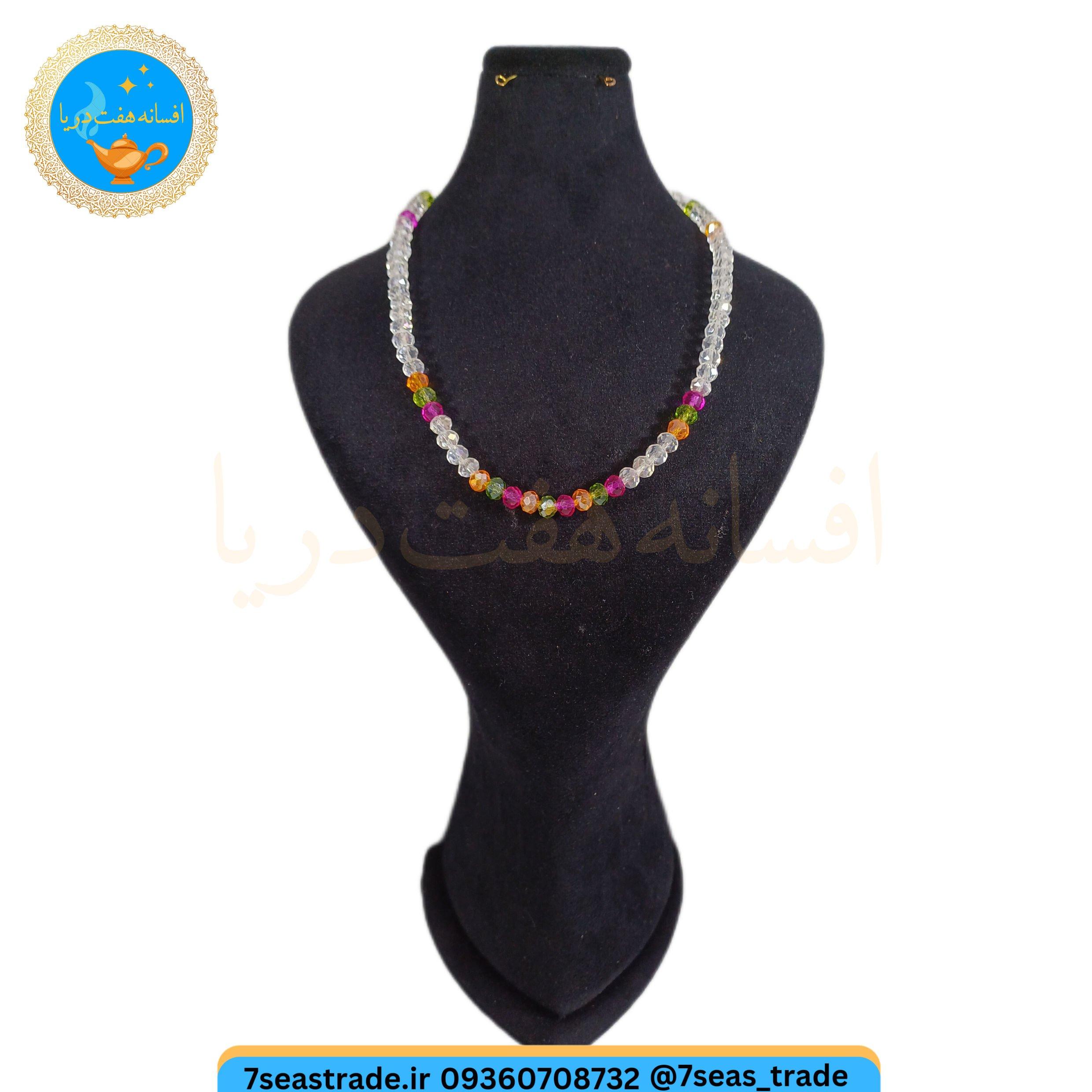 گردنبند دست ساز کریستال بی رنگ و ریزه کار کریستال صورتی سبز نارنجی مدل سپیده